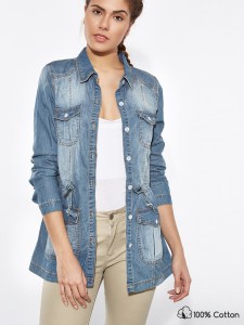 Βαμβακερή ζακέτα denim με τσέπες και κορδόνι στην μέση