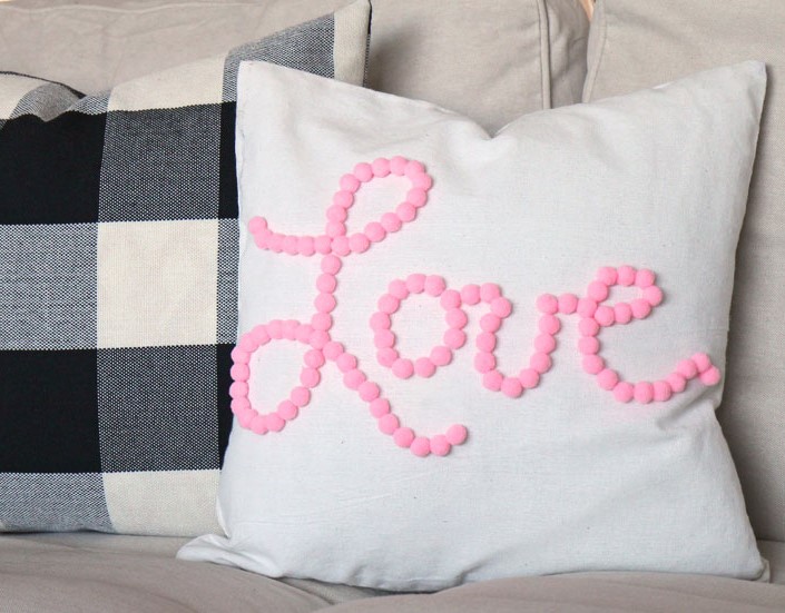 Στη συγκεκριμένη περίπτωση διαλέξαμε να μεταμορφώσουμε ένα απλό άσπρο μαξιλάρι, σε ένα ρομαντικό και άκρως κοριτσίστικο, που να γράφει τη λέξη “love” με ροζ pom pom.