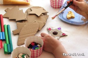 Μετά, με ένα ψαλιδάκι κόψε τα σχήματα. Εφάρμοσε το πατρόν πάνω σε χαρτόνι και κόψε προσεχτικά. Το πρώτο σου στολίδι είναι έτοιμο και σε περιμένει να το ζωγραφίσεις ή διακοσμήσεις όπως θες. Στο κέντρο και στο πιο ψηλό σημείο του στολιδιού κάνε μια τρυπούλα με μία πρόκα και πέρασε μια κορδελίτσα. Έτοιμο να το κρεμάσεις στο δέντρο σου!