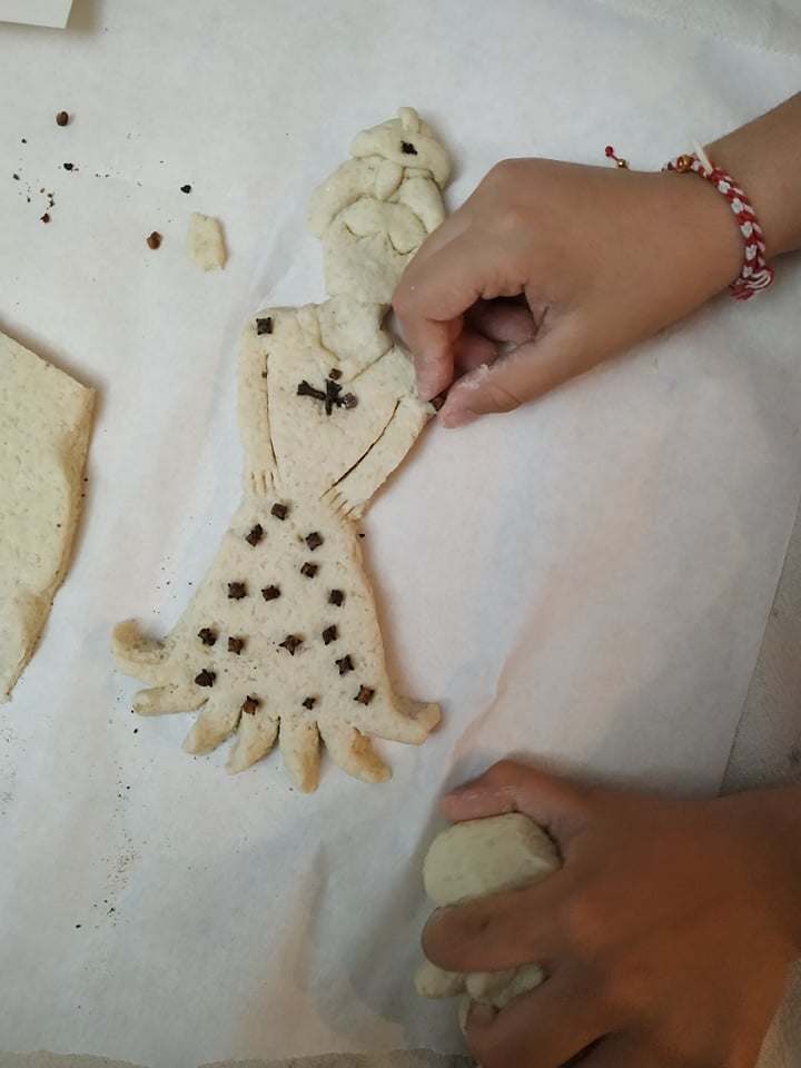 Πλάθουμε την Κυρά Σαρακοστή με το ζυμάρι φτιάχνοντας το σώμα, τη φούστα, το πρόσωπο, τα πόδια της, τη διακοσμούμε όπως θέλουμε και τη βάζουμε σε ένα ταψί το οποίο έχουμε στρώσει με λαδόκολλα.