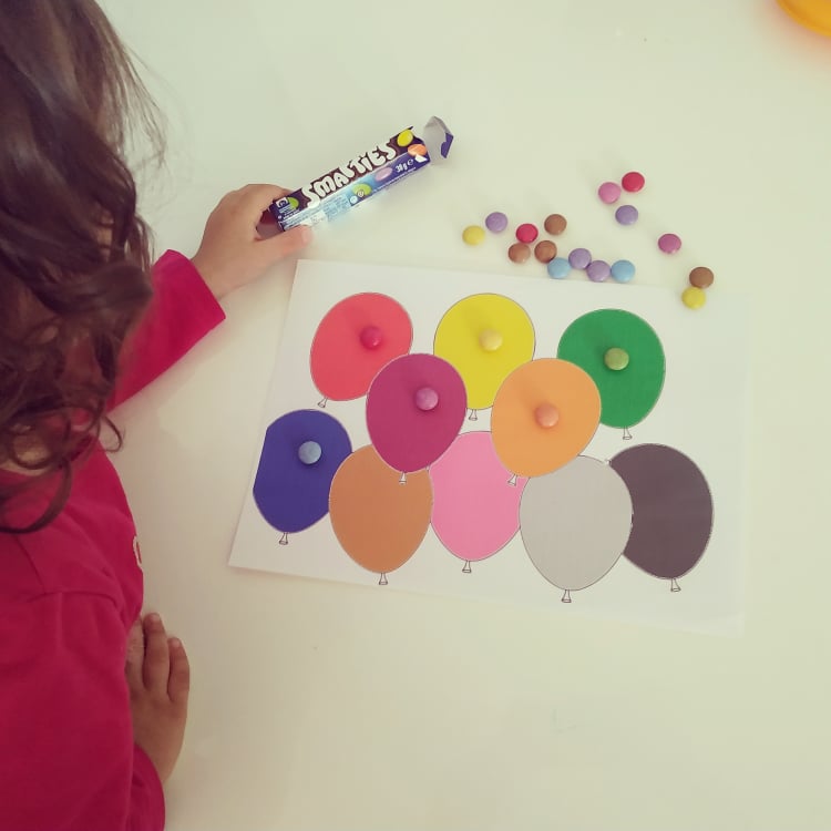 Δώσε στο παιδί σου τα Smarties και δείξ’ του πώς να αντιστοιχήσει το σωστό χρώμα στο σωστό μπαλόνι. Επαναλάβετε αρκετές φορές έως ότου βαρεθεί το παιδάκι σας. Στο τέλος επιβραβεύστε το δίνοντας του να φάει μερικά κουφετάκια. Με αυτή την δραστηριότητα επιτυγχάνουμε 2 πράγματα:
